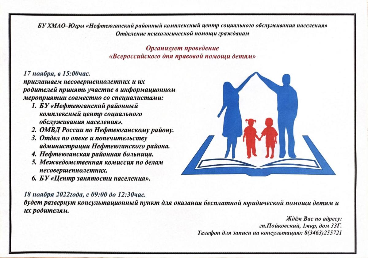 18 ноября 2022 года с 09:00 ч. до 12:30 ч. будет развернут консультационный пункт для оказания бесплатной юридической помощи детям и их родителям: