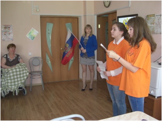 Далее мероприятие продолжилось в отделении-интернат. Нас посетили участники Волонтёрского отряда «ЭРОН», познакомили с историей становления Российского флага, порадовали «Триколором», сделанным своими руками.