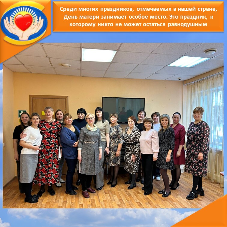 Среди многочисленных праздников, отмечаемых в нашей стране, День матери занимает особое место. Это праздник, к которому никто не может остаться равнодушным. День матери — теплый и сердечный праздник, который своим приходом напоминает, что в жизни каждого из нас самый главный человек — это мама. В преддверии самого светлого и доброго праздника Дня матери специалисты БУ «Нефтеюганский районный комплексный центр социального обслуживания населения» готовят и проводят различные мероприятия для получателей социальных услуг. Но в отделении социальной реабилитации и абилитации граждан пожилого возраста и инвалидов этом году все получилось наоборот. Участники программы «Университет третьего возраста» своими силами подготовили программу и пришли поздравить с этим замечательным праздником работников нашего учреждения. В ходе мероприятия звучали самые добрые, нежные слова, песни, стихи о мамах. Никто из присутствующих в зале не остался равнодушным. От души поздравляем всех мам с этим замечательным праздником! Крепкого здоровья, семейных радостей, благополучия и искренней любви ваших детей!